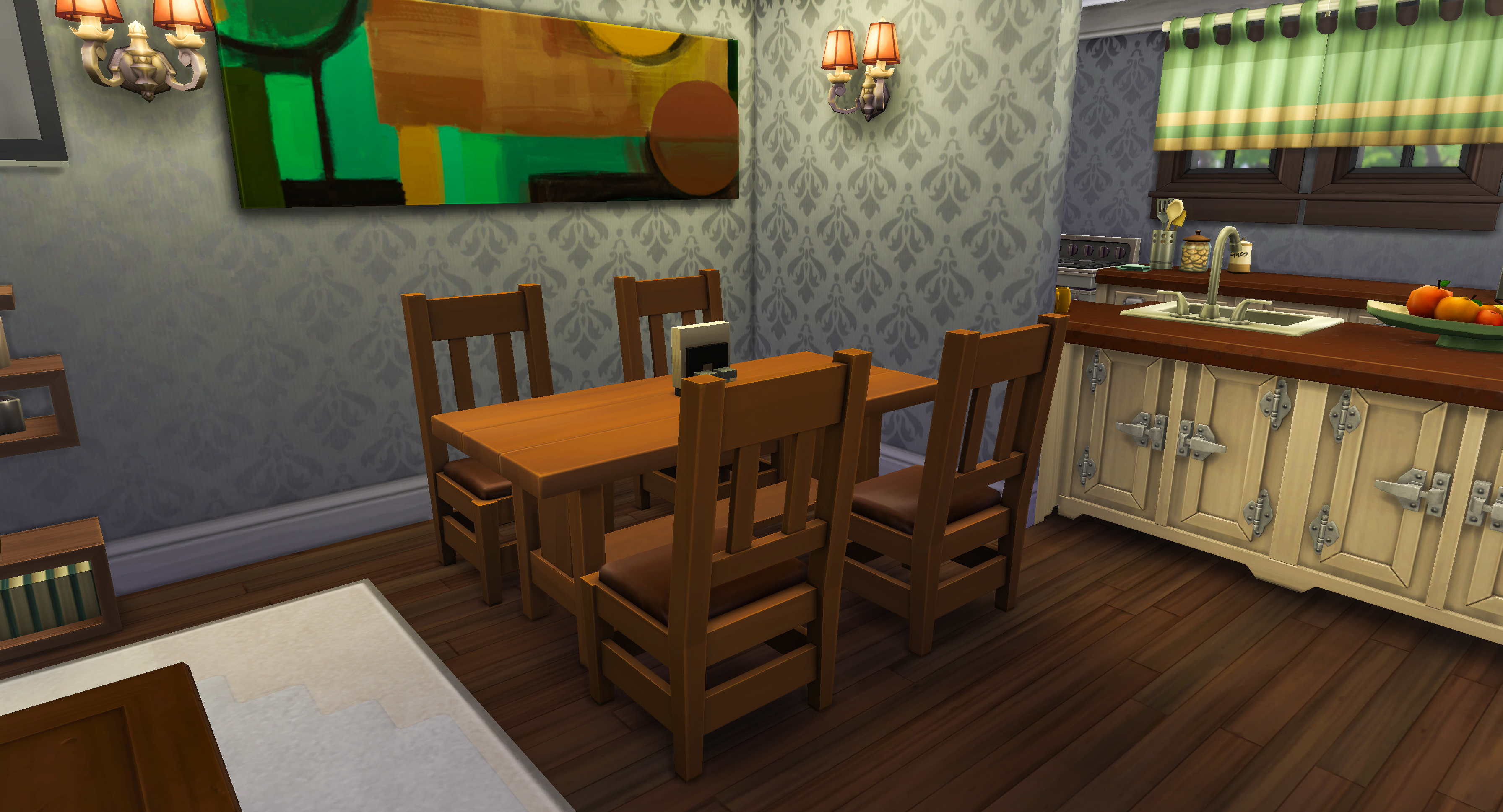 The kitchen and living space flow seamlessly together, making it ideal for everyday family gameplay or relaxed couple saves. Rustic cabinetry pairs with warm countertops, and the dining table sits comfortably within reach of the living room’s cosy fireplace feature.