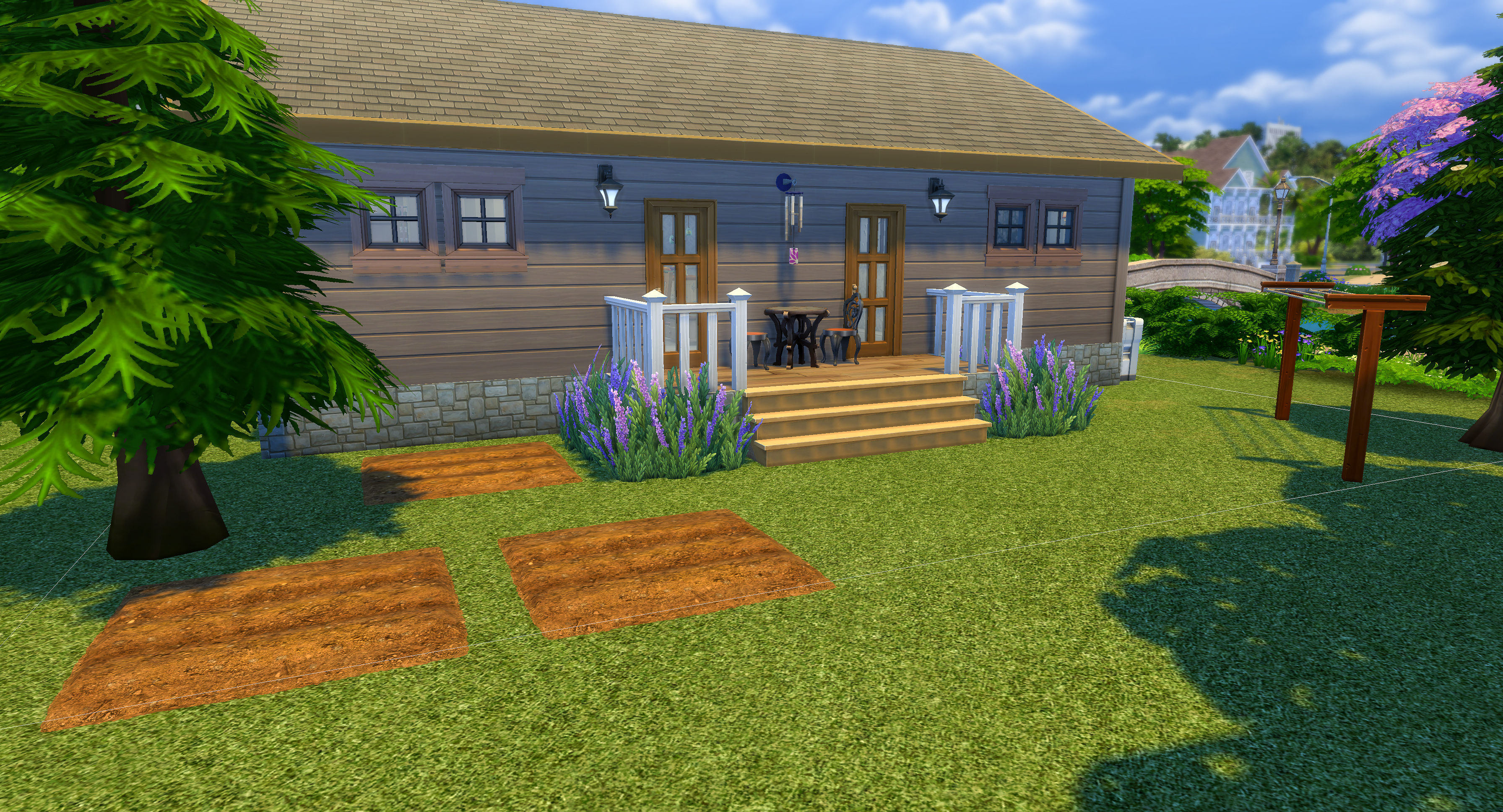 The small but charming garden offers ready-made planting plots for gardening Sims or simple living gameplay. Whether growing produce, herbs, or decorative blooms, the space feels manageable and peaceful.