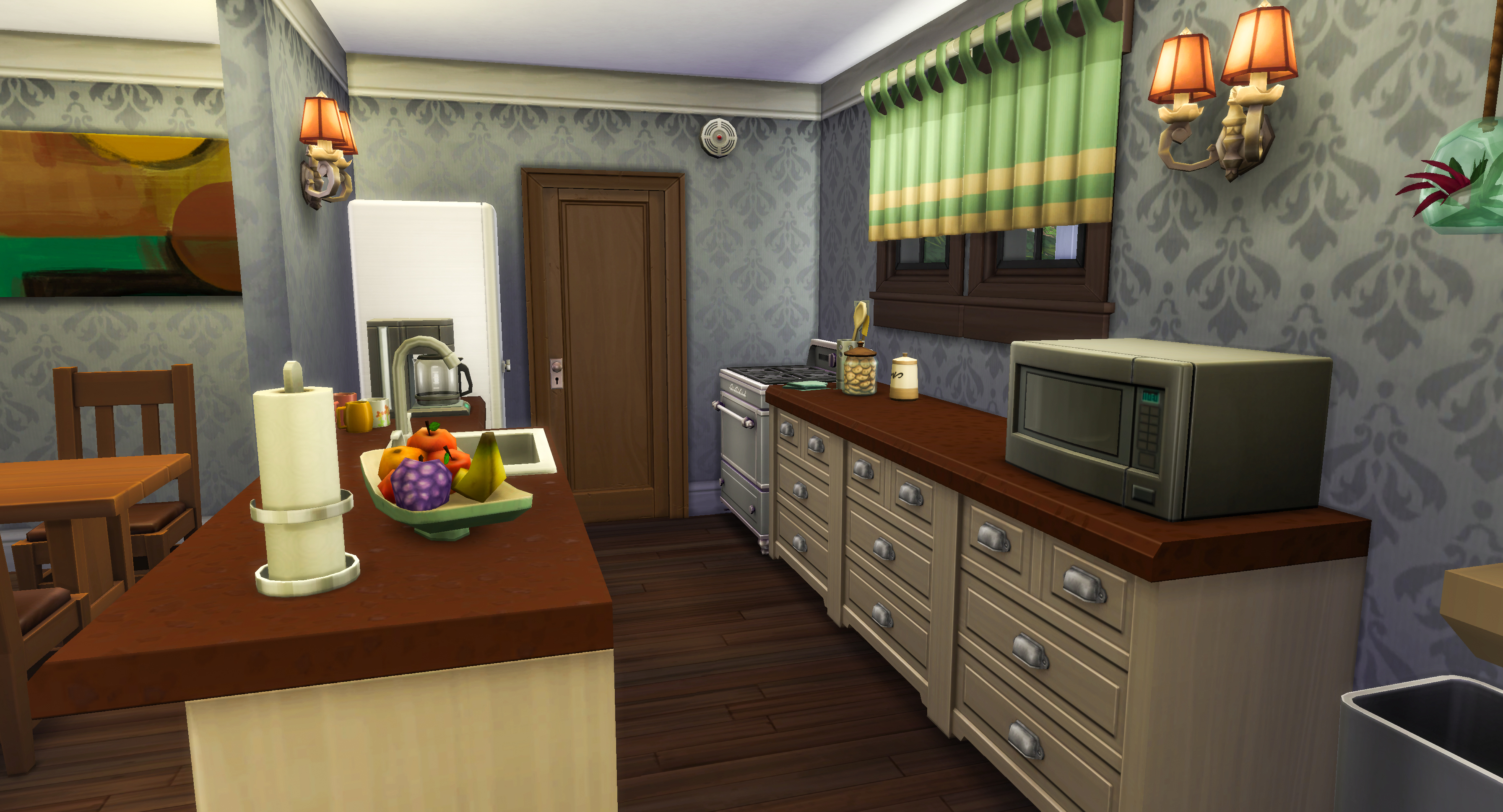 Morning begins softly, light filtering through the windows while coffee brews in the kitchen. One Sim tends the garden plots while another lingers at the dining table.