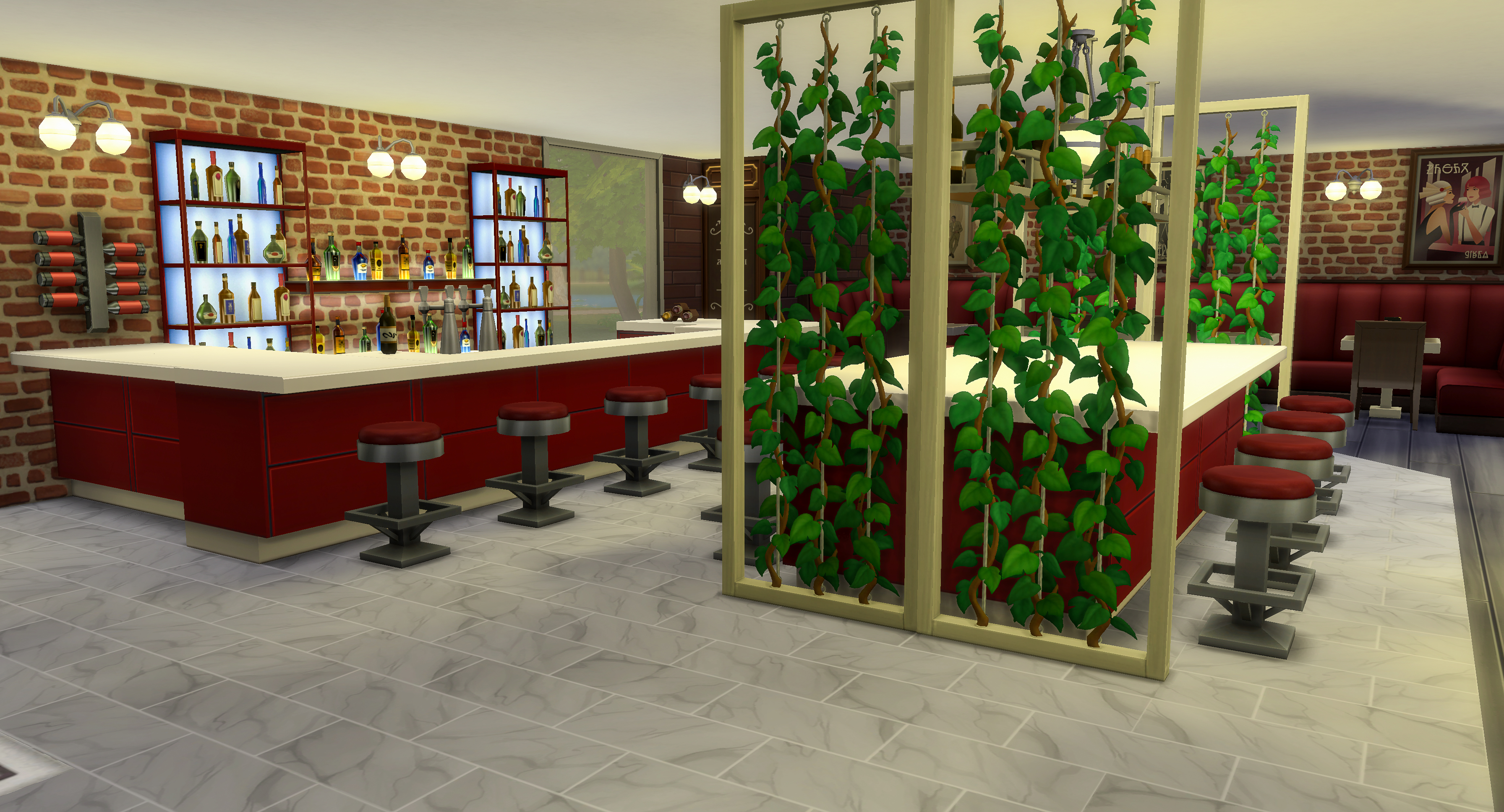 Framed by brick walls and glowing shelves of bottles, this area offers the perfect place for Sims to enjoy drinks before dinner or linger after their meal. Counter seating keeps the atmosphere lively while maintaining a relaxed trattoria feel.