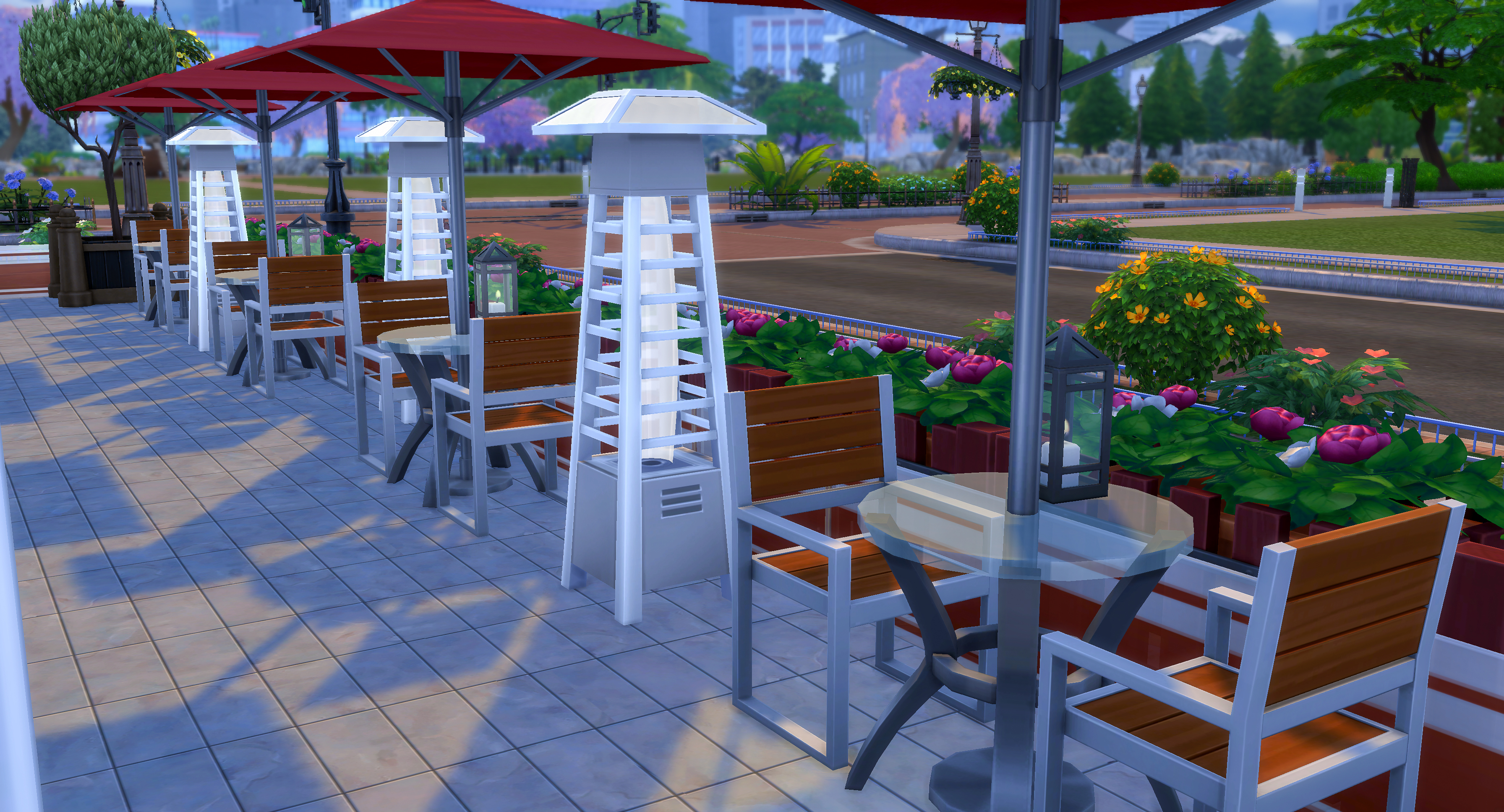 Outside, patio tables fill with Sims enjoying the cool evening air beneath red umbrellas.