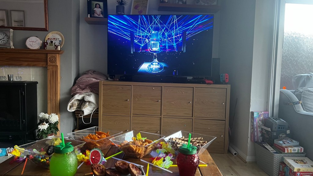 We stretched out on the sofa, cocktails still flowing, snacks ready, dog wedged between us — and judged songs we absolutely could not pronounce.
