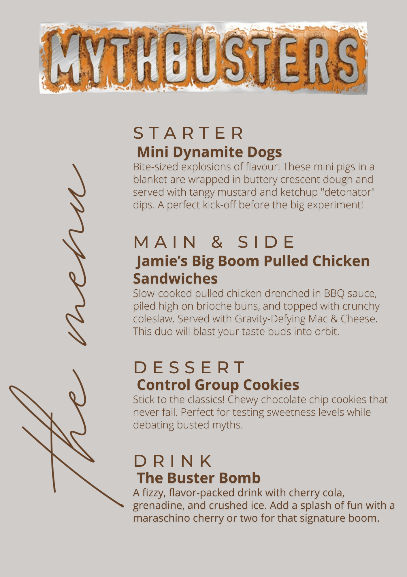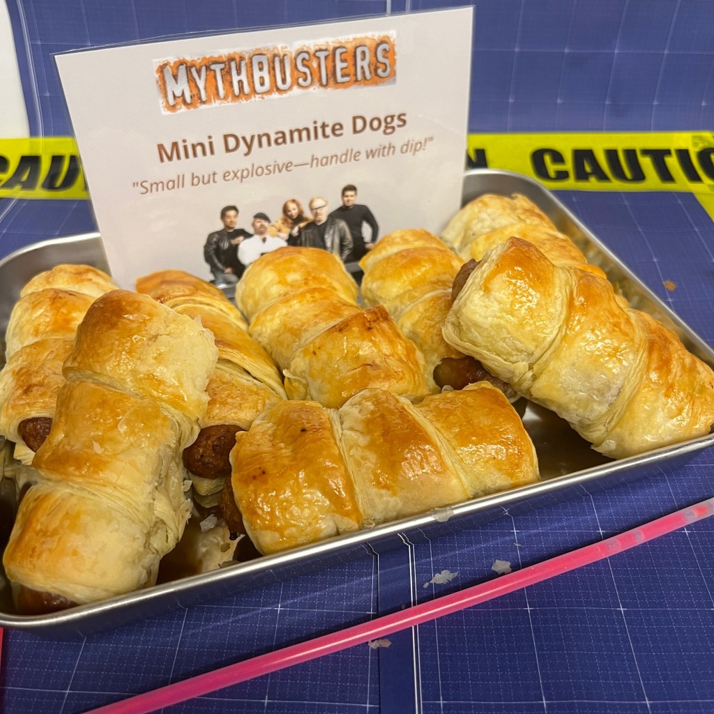 Before we dive into the breakdown, here’s the full experiment plan — our official lab blueprint for the evening. Every course was chosen with just the right balance of comfort, chaos, and dramatic naming potential, because what’s a Mythbusters night without a little flair? This menu set the tone before a single glow stick was cracked or a single countdown was shouted — and honestly, seeing it all laid out made it feel like we were about to run a very important (and very delicious) experiment.