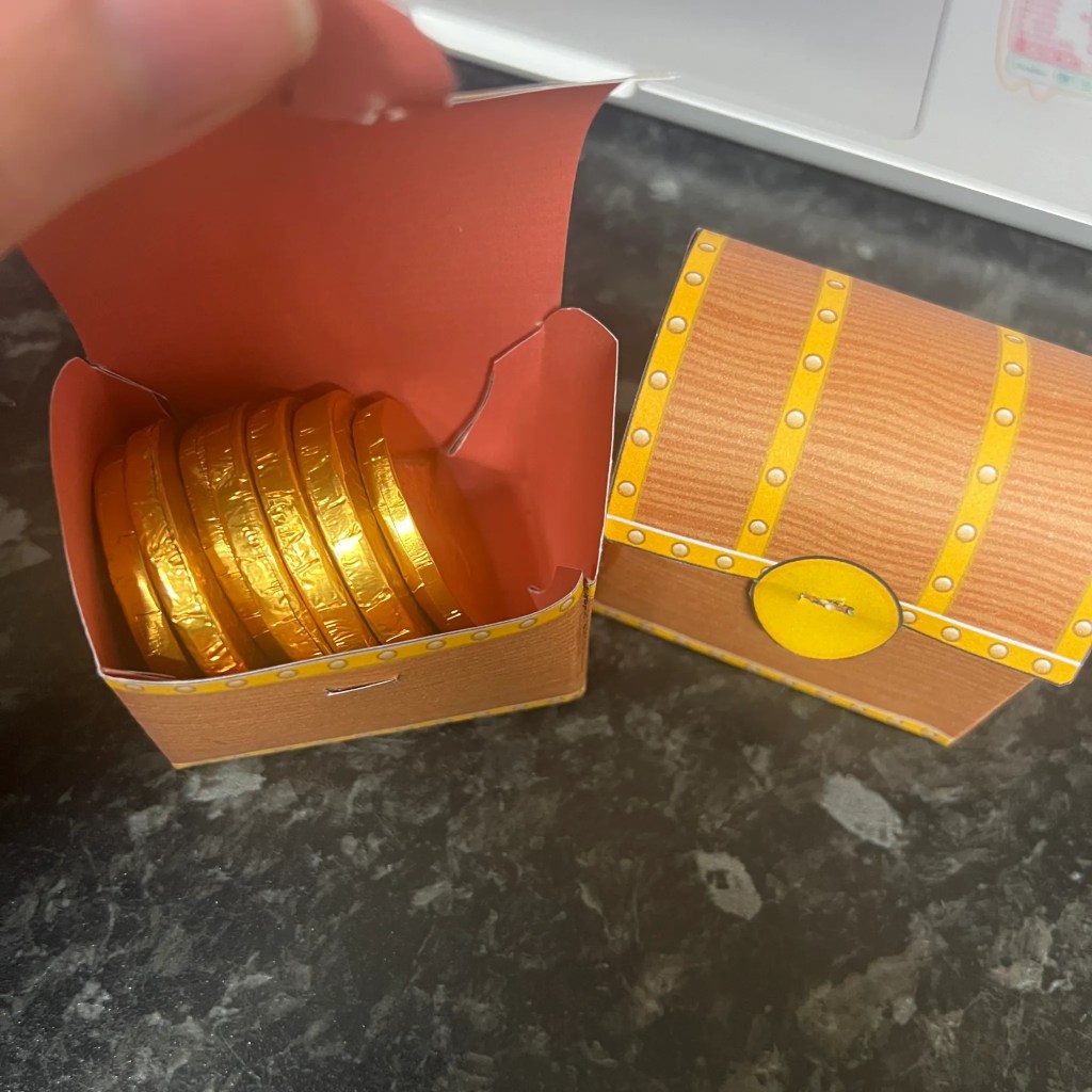 At the end of the hunt, their hard work paid off with a mini treasure chest filled with shiny chocolate coins.