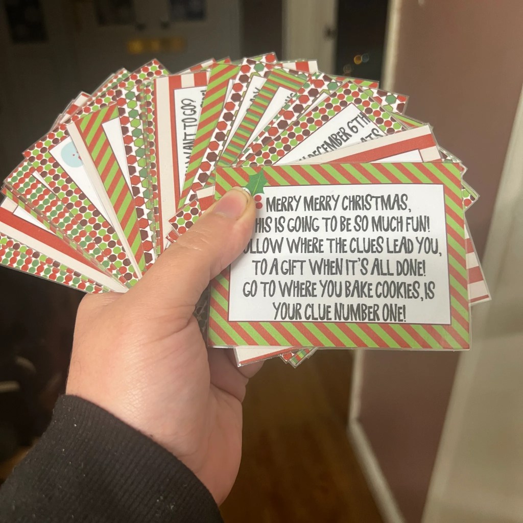 ⢠Scatter 5ā8 clue cards around your home (or be extra like me and do 24!) ā each answer leading to the next hiding spot.