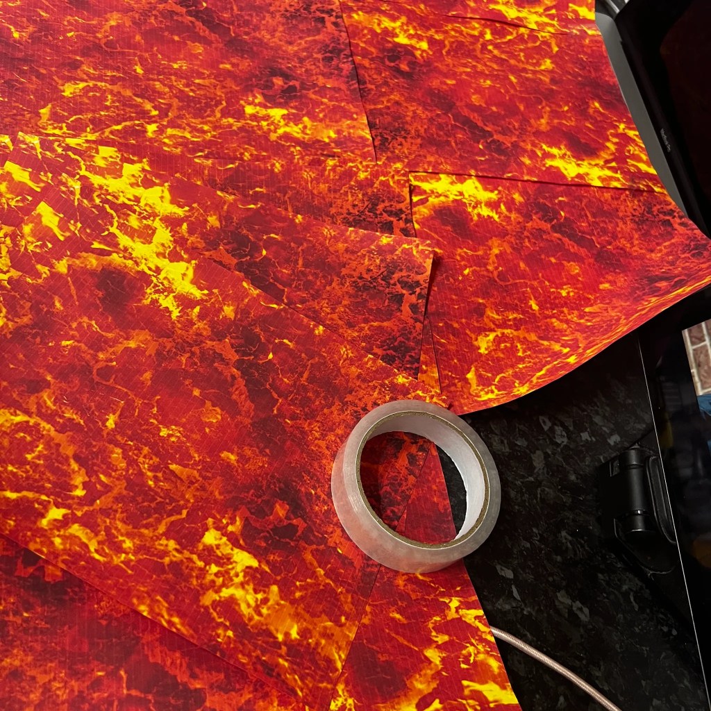 I printed a bunch of lava texture images, taped them together into one giant molten masterpiece, and spread them across the floor to create the illusion of flowing lava.