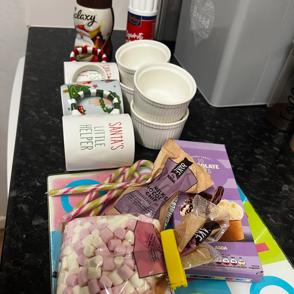 Mugs were lined up on the counter, bowls filled with toppings, and everything was ready for a cosy cocoa moment — marshmallows, chocolate chips, whipped cream, candy canes… the works.