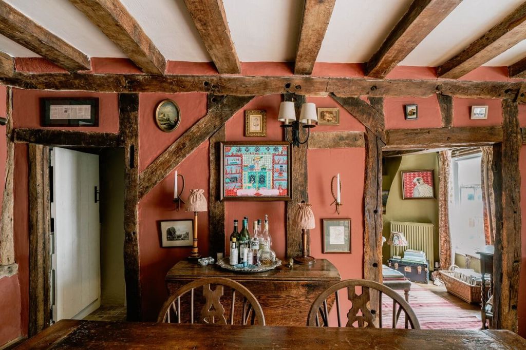 - Traditional English cottages and farmhouses with steep pitched roofs, thatch or slate tiles, and irregular forms