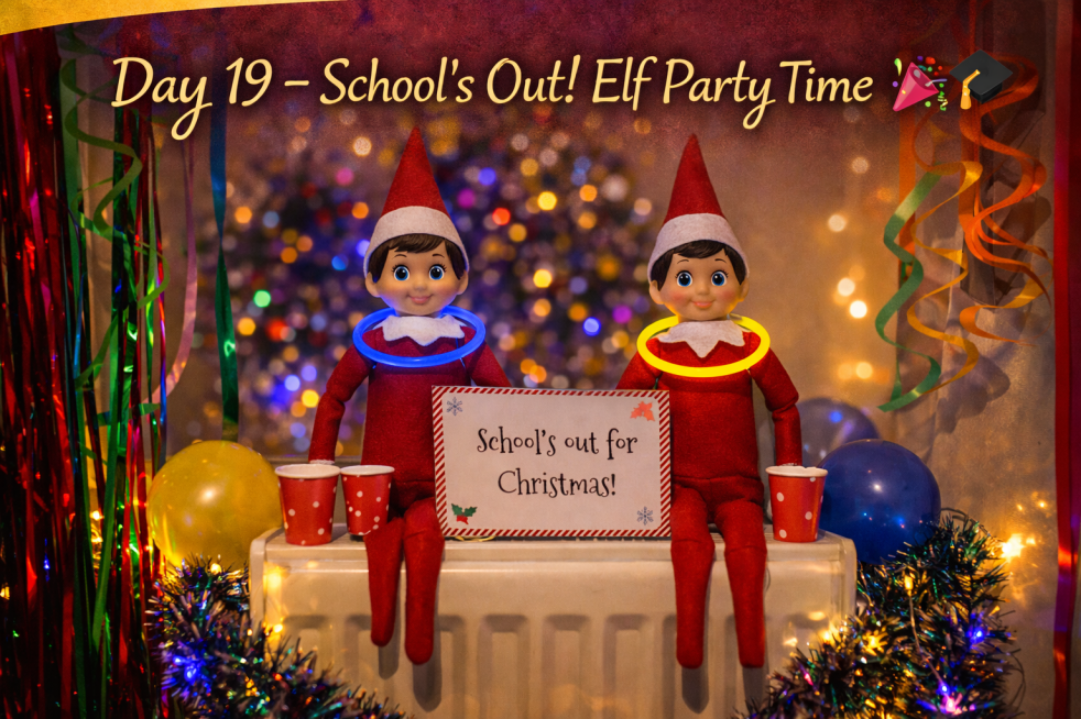 Elvis and Toffee kicked off Christmas break in style with a tiny end-of-term party. Glow sticks, festive decorations, and a cheerful โSchoolโs Out for Christmasโ sign made this elf setup the perfect start to holiday celebrations.