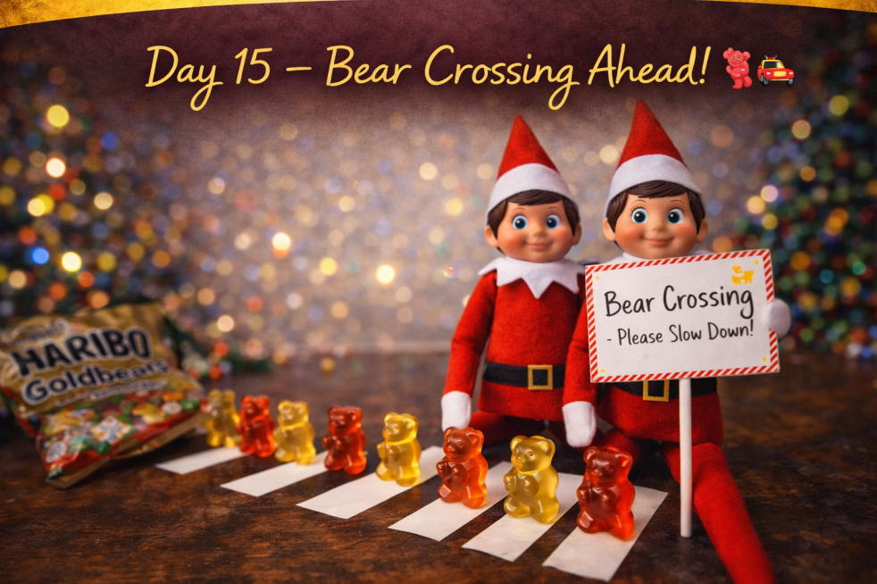 The elves turned the floor into a tiny traffic scene overnight, helping a parade of gummy bears safely cross at their very own Bear Crossing. With Elvis on crossing patrol and Toffee supervising the sweets, this simple setup brought plenty of giggles before breakfast.