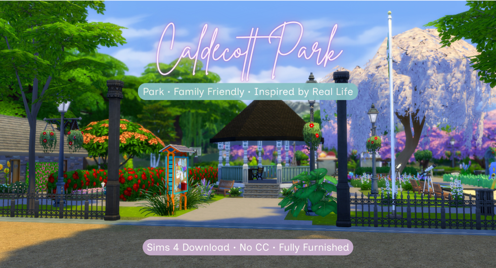 Inspired by my hometown, Caldecott Park is a cozy community lot designed for everyday Sims life. Featuring a central bandstand, play areas, picnic spots, and flower-lined paths, this park is perfect for families, storytelling, and slow, nostalgic gameplay.