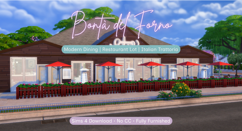 Bontà del Forno is a modern Italian restaurant build for The Sims 4, designed with cozy booth seating, a lively bar, and a fully equipped kitchen. With indoor dining, outdoor patio seating, and a striking central aquarium feature, this no-CC community lot is perfect for date nights, celebrations, and storytelling gameplay.